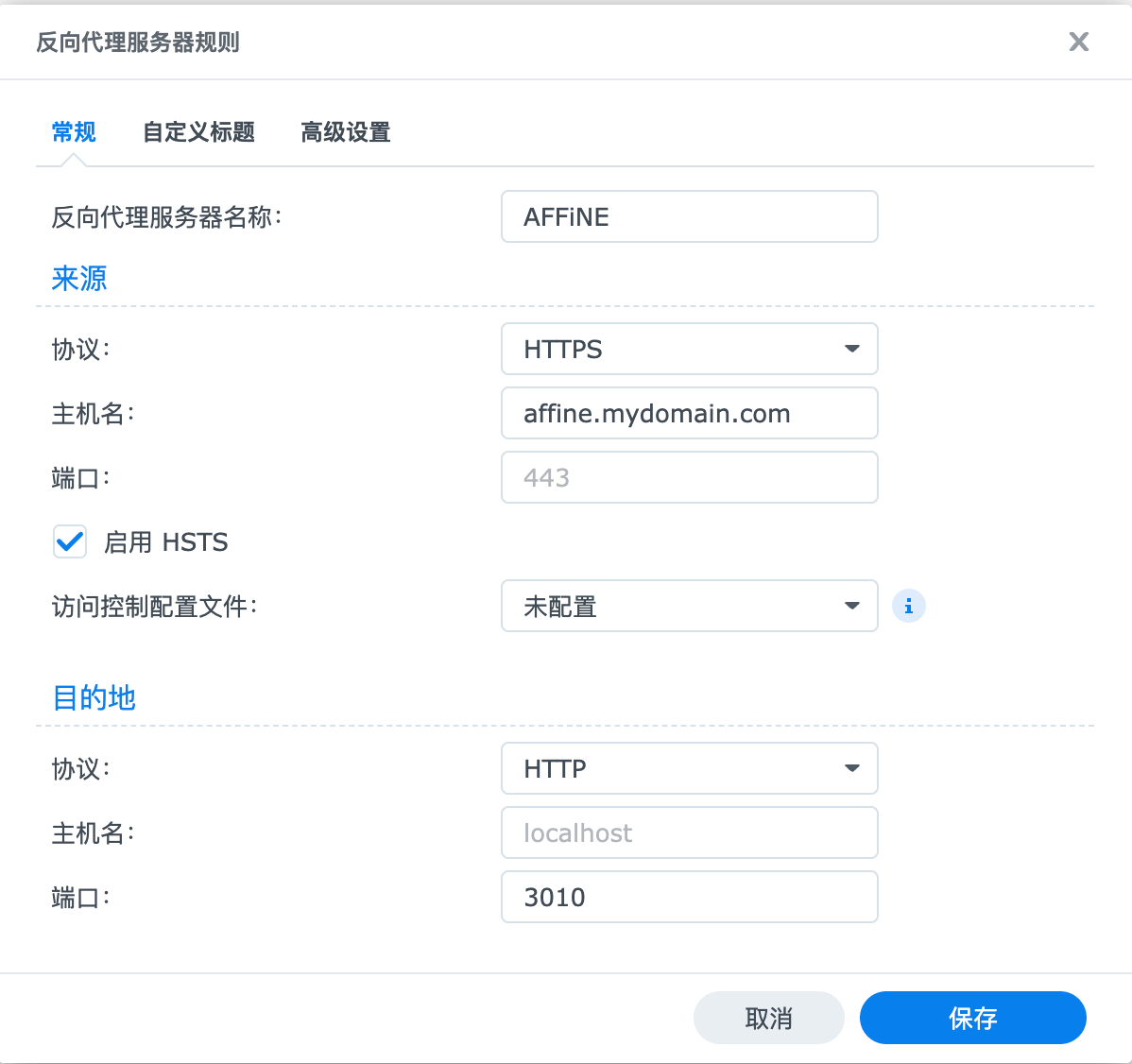 When I deployed AFFiNE, I mapped it to local port 3010, so the reverse proxy rule looks like this: