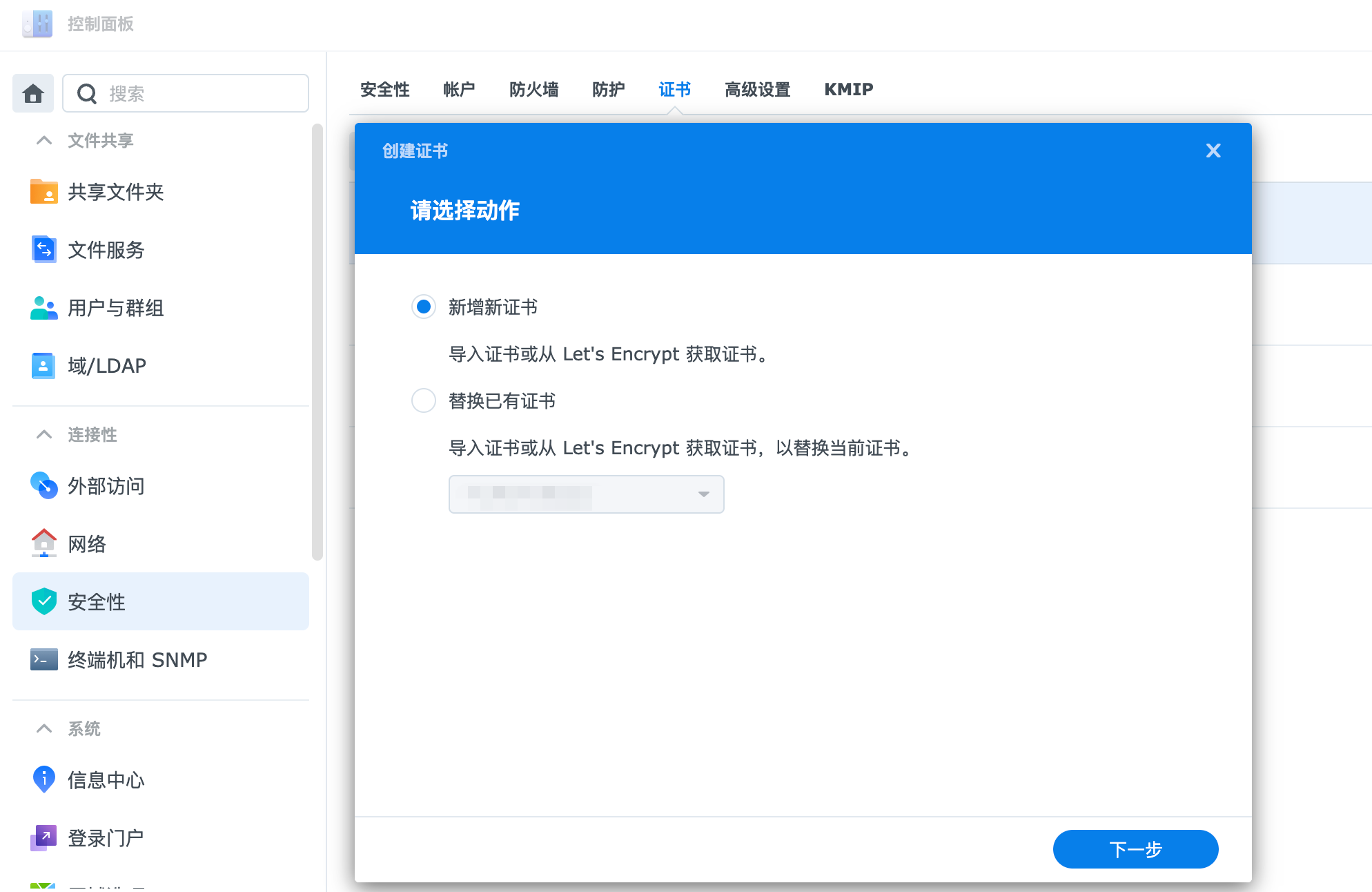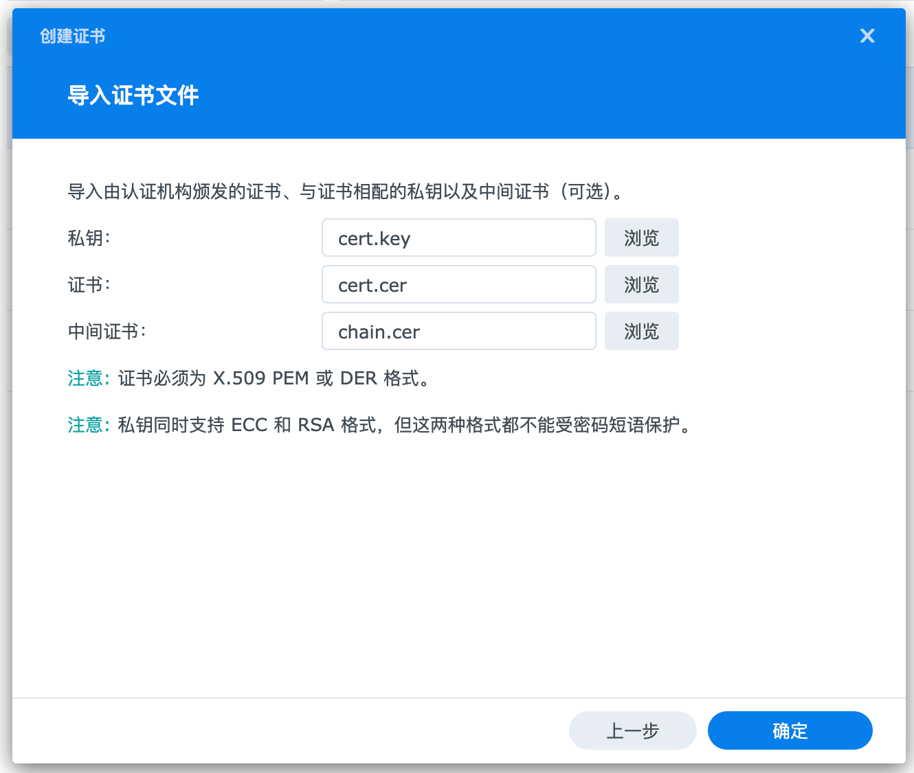 Log into DSM and go to Control Panel → Security → Certificate → Add.
